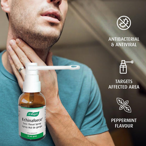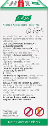 Echinaforce Sore Throat Spray from A.Vogel is used to treat painful inflammation and infection of the throat such as pharyngitis, tonsillitis, soreness and hoarseness.